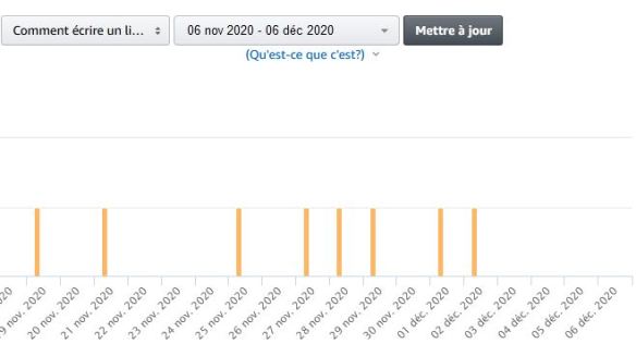 Du 19 Novembre au 2 Décembre, 8 copies de mon livre Comment écrire un livre ont été achetées sur Amazon. Chaque fois que j’allais vérifier mon tableau de ventes et que je voyais une nouvelle barre orange apparaître, j’étais comme, ben voyons, encore? Ça se peut pas!