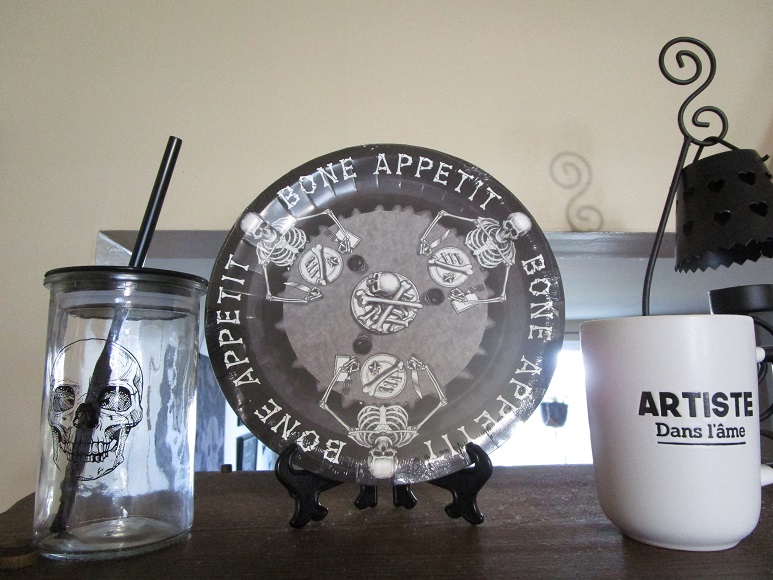 Ce sympathique bras de squelette émerge de mon pot d’ustensiles… Je ne peux pas m’empêcher de lui faire un 👍 chaque fois que je passe près de lui!