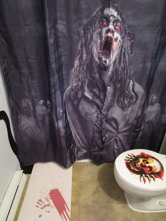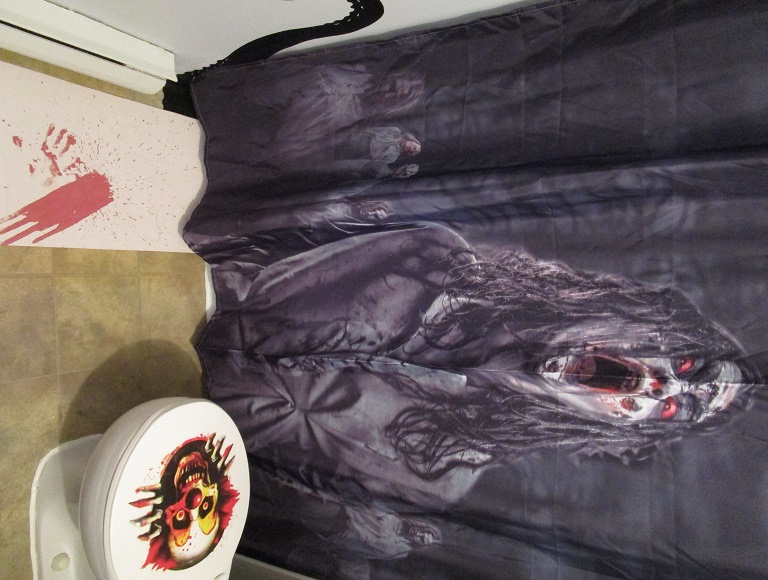 Pour le mois d’octobre, je le remplace par ce très invitant rideau mettant en vedette des zombies qui, en fait, semblent être tous la même fille qui porte des costumes différents. (Non, ce n’est pas moi, hélas…)