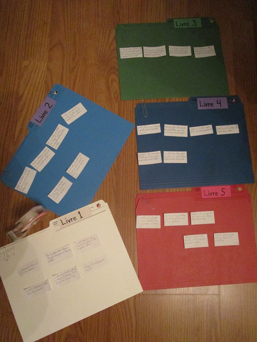 À quoi me sert cette grosse révision-là? Surtout à revisiter mon histoire du début, pour prendre des notes en vue d’écrire la conclusion de chaque personnage. Mais j’en profite aussi pour modifier des dialogues que je trouve un peu embarrassants, pour enlever des phrases qui n’ont pas rapport, ou pour changer des mots.
