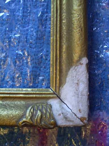 Première évaluation des dommages: Un gros morceau de moulure de coin disparu, quelques bouts cassés sur les trois autres coins, des craquelures en masse, et de la peinture écaillée sur les côtés. Confiante en mes habiletés, je dis à ma mère que je vais réussir à le réparer. Je le range dans ma chambre, et il reste là, jusqu’à aujourd’hui.