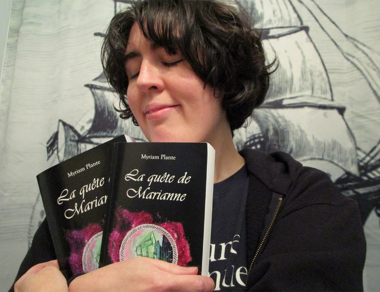 Bonjour, je m’appelle Myriam, et le livre auquel je fais un câlin sur cette photo, c’est La quête de Marianne. C’est vraiment le roman dont je suis la plus fière! 🥰 Je l’ai préparé dans ma tête pendant des années, avant de l’écrire.