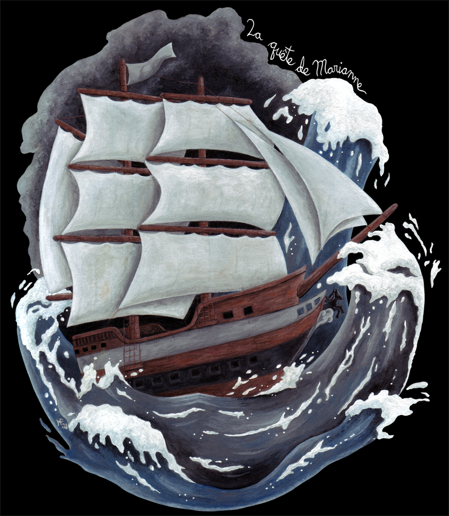 Cette illustration du navire Le Noble Coursier dans une tempête, c’est un des designs que tu peux acheter sur un t-shirt ou un sac.