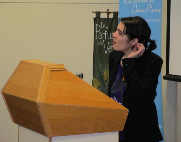 Sachez aussi que je travaille toujours sur le tome 2. Selon mes savants calculs, si le tome 2 désire avoir la même longueur que le tome 1, j’en ai environ la moitié d’écrit. La moitié d’écrit, en 1 an. Alors que Le Parfum du Vent a été écrit sur une période de 10 ans… Ça fait bizarre. C’est comme si j’avais l’impression d’avoir travaillé trop vite, parce que ce n’est pas normal de pouvoir écrire un livre en 2 ans au lieu de 10! On dirait que ça me fait un peu peur. Mais pourtant, c’est ça qu’il faut! Si j’étais condamnée à ne publier qu’un livre à tous les 10 ans, je n’en publierais pas beaucoup au cours de ma vie, tsé!