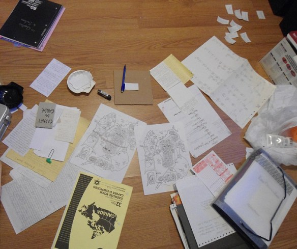 Deuxièmement: comme je l’ai expliqué dans mon dernier blogue, je devais avoir 13 ou 14 ans quand j’ai créé le monde de Sechora, et quand j’ai décidé d’écrire un livre, pour de vrai. J’avais déjà écrit plusieurs histoires (inachevées), des tentatives de livres, mais c’était la première fois que j’avais l’intention d’écrire un vrai livre. En plus, j’ai choisi d’écrire un livre assez complexe… Comme je ne l’avais jamais fait avant, je ne savais pas vraiment comment faire. Écrire, c’est facile (plus ou moins facile…) mais planifier un roman, une histoire cohérente qui met en scène plusieurs personnages, et ne pas se perdre dans ses notes, je pense que ce n’est pas un talent inné! Je ne savais pas comment faire, donc j’ai fait comme j’ai pu, mais mon travail manquait d’organisation.